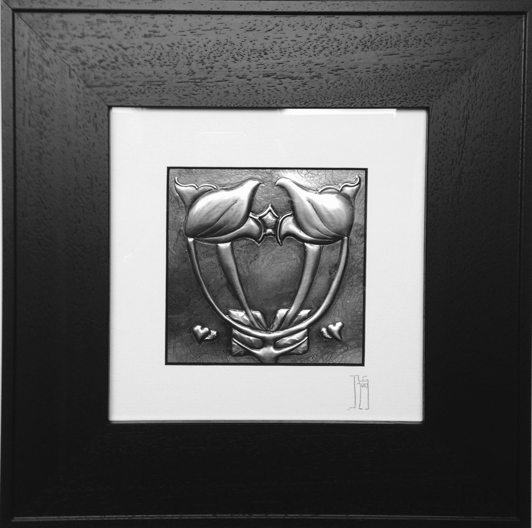 Having spent many years working in Glasgow's west end Judith was and still is a frequent visitor to Kelvingrove Art Galleries where there are many examples of the work of the Glasgow Girls. This has had a huge influence on Judith's work alongside all the beautiful art nouveau tiles to be found in Glasgow which is well know for all of its Victorian tenement buildings with their 'wally closes' . The repousse pewter designs are 11cm squared and framed measure approximately 30cm square and can be ordered in the black or white wood frames as illustrated below. They can also be ordered in a white mount only.