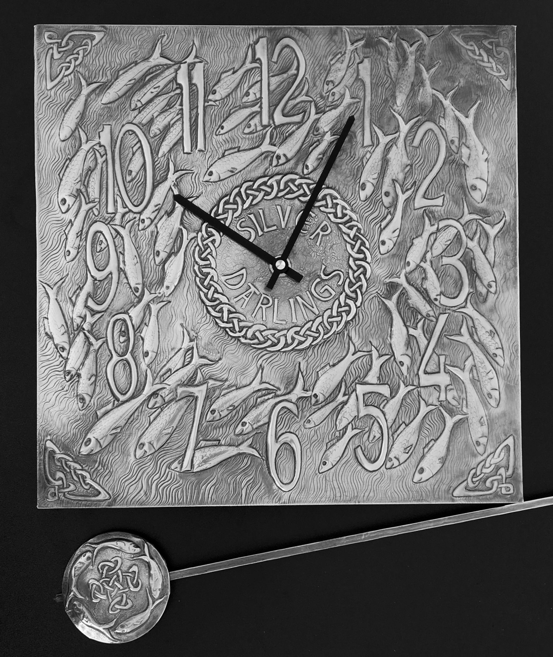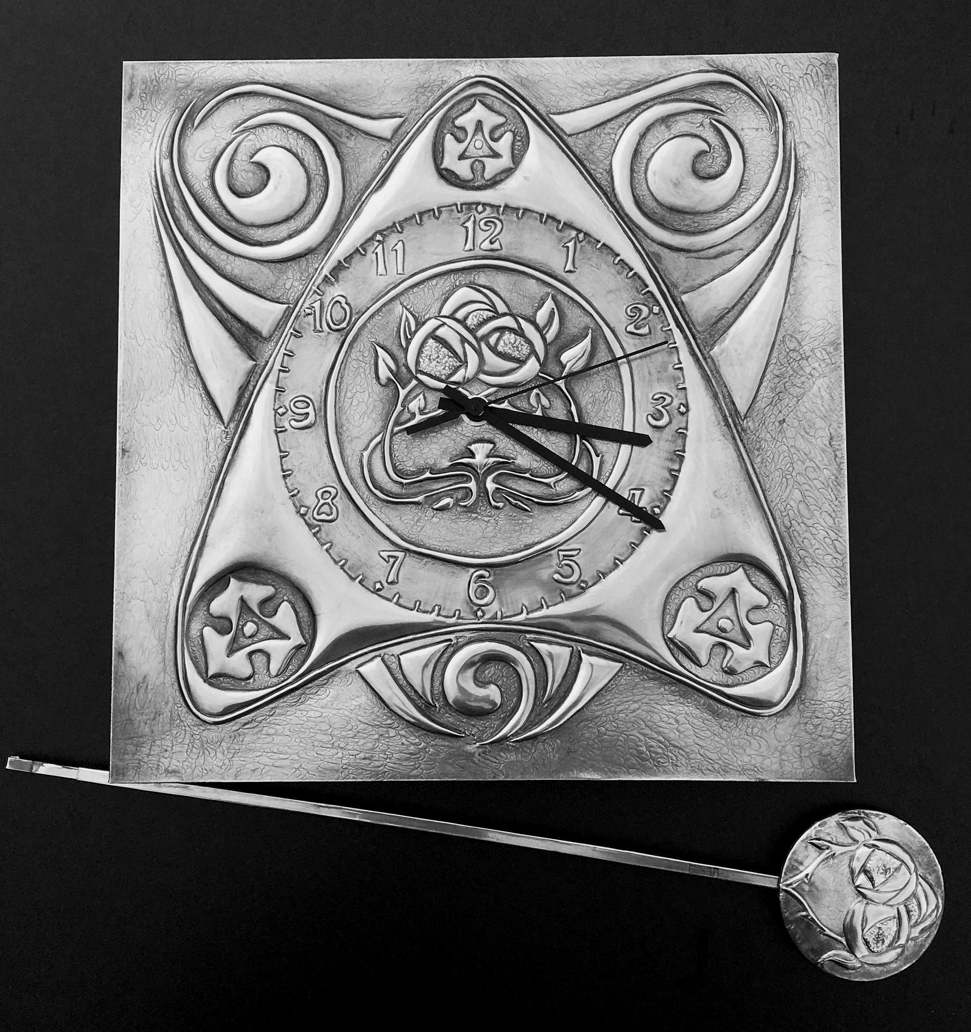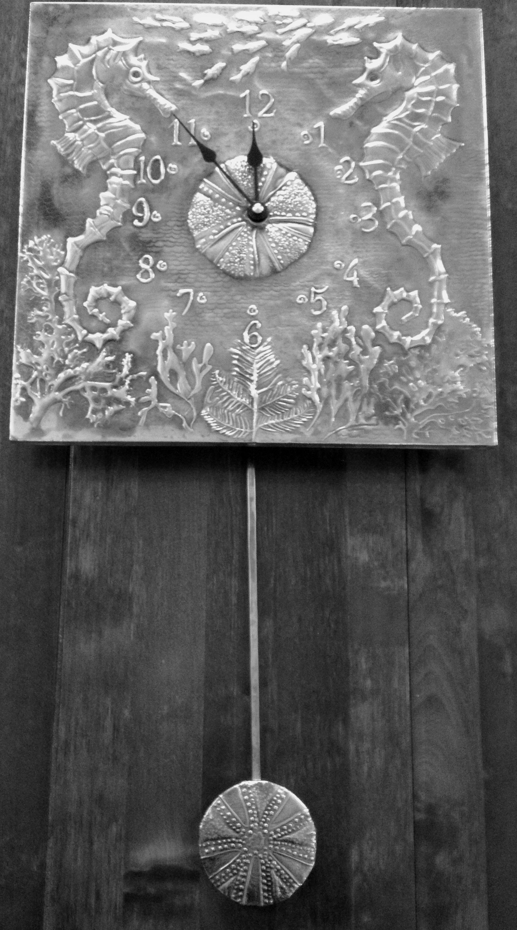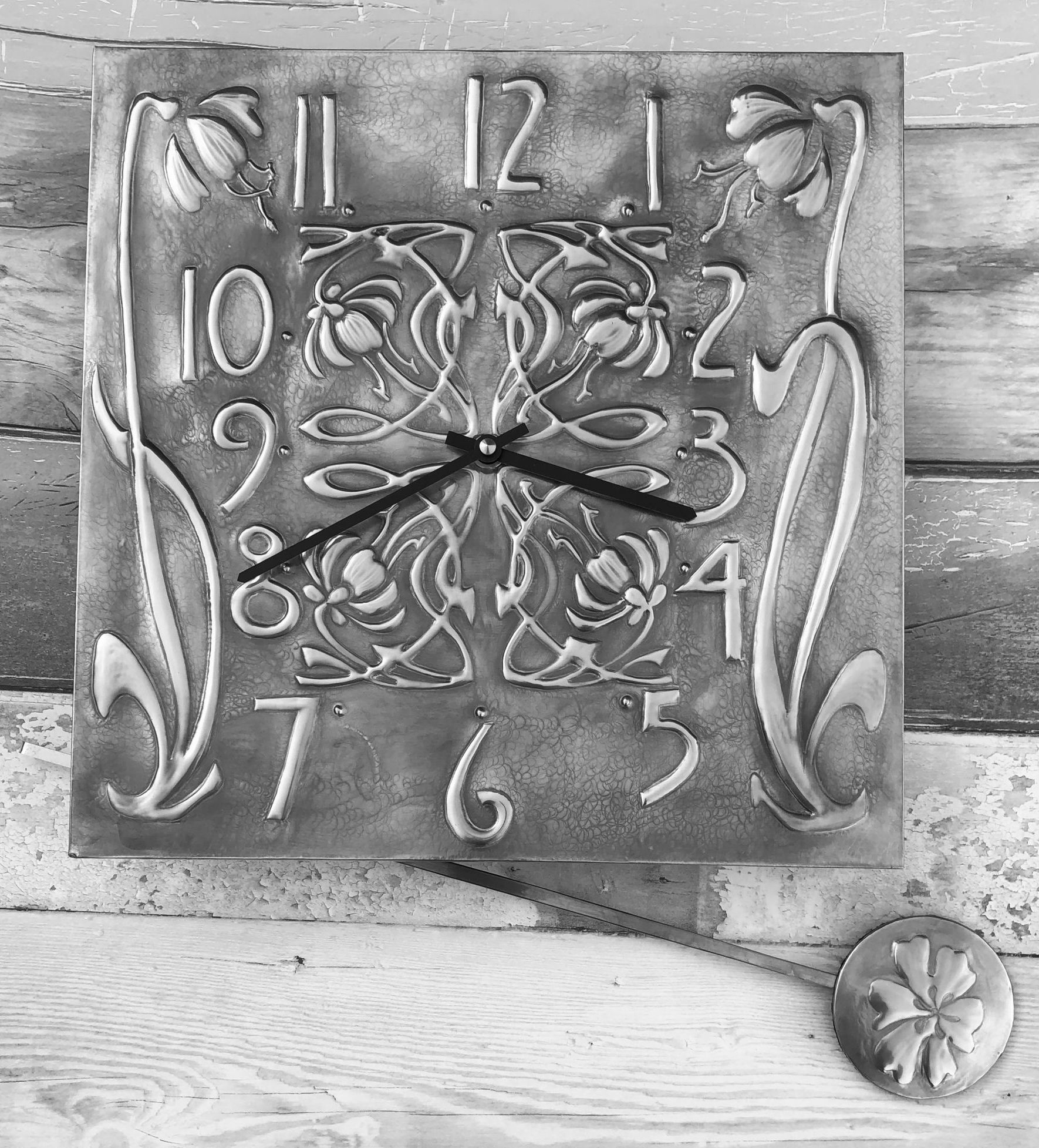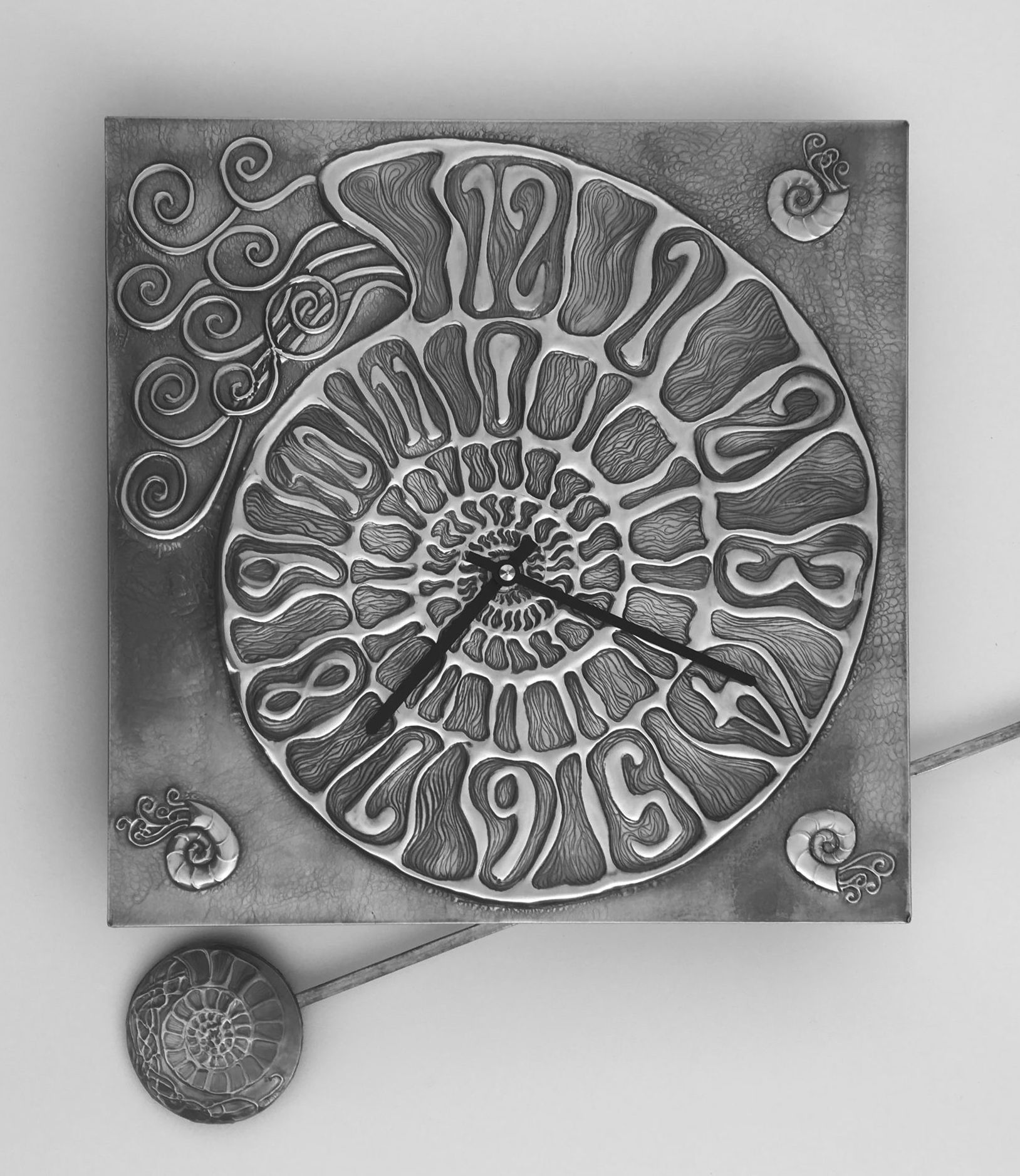 A selection of pendulum designs each is made individually by hand using the repousse/embossing technique in pewter metal. The pewter shim is shaped by hand into the design and is then place over a wooden base for strength. The final design is patinated and polished. Each clock measures 30cm square with a 30 cm pendulum drop. The clock is a German quartz mechanism and requires 1xAA battery.