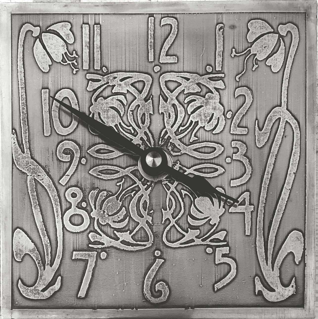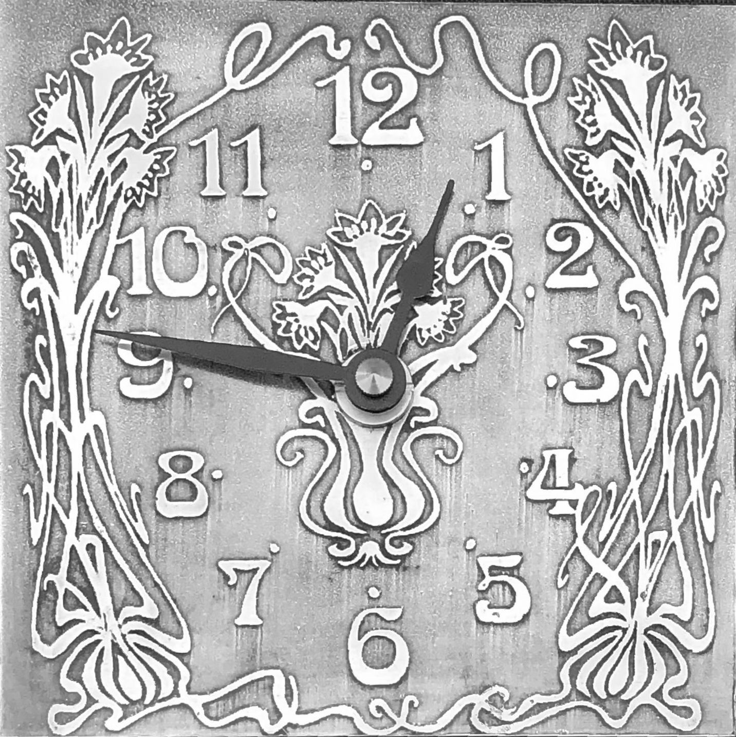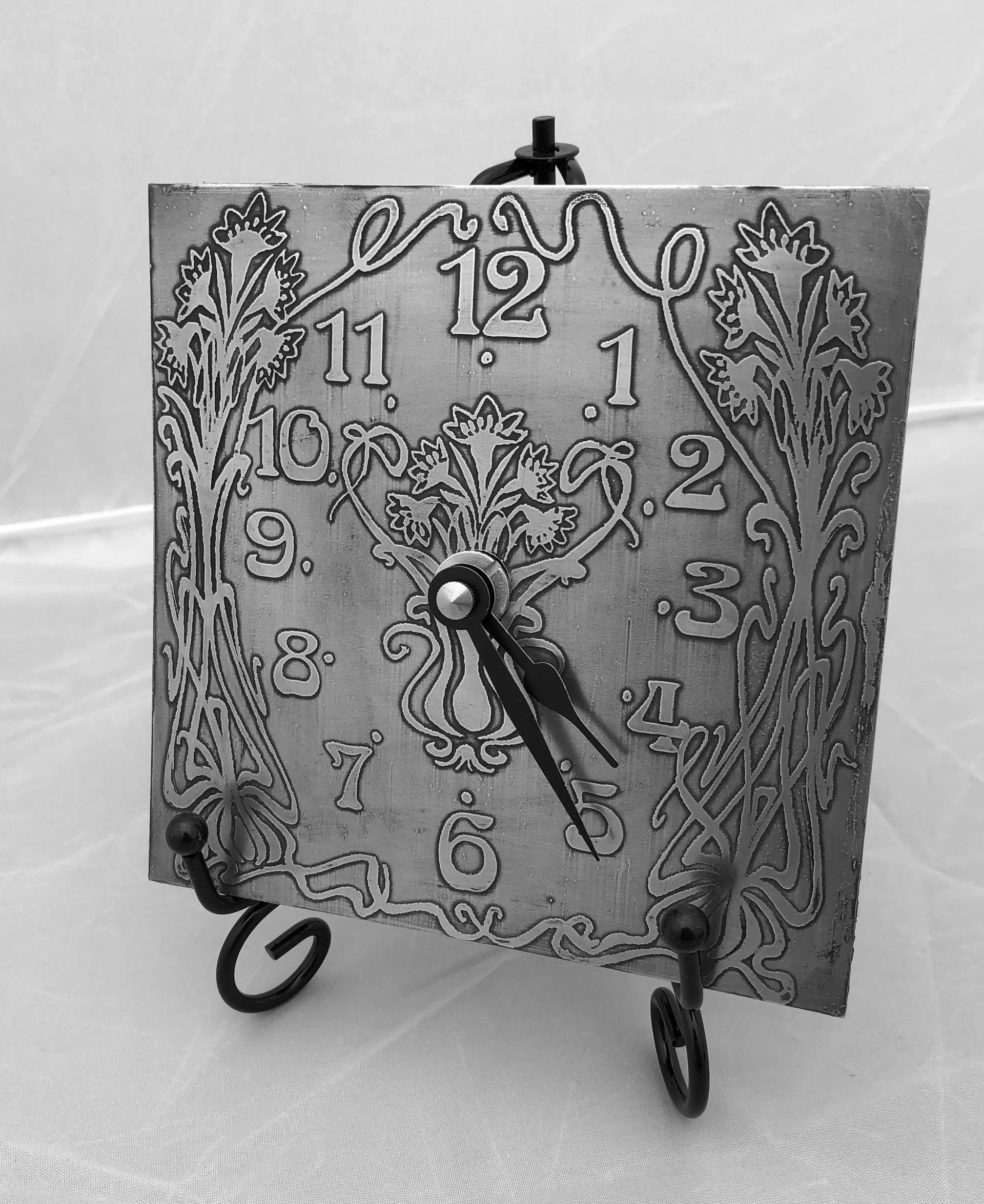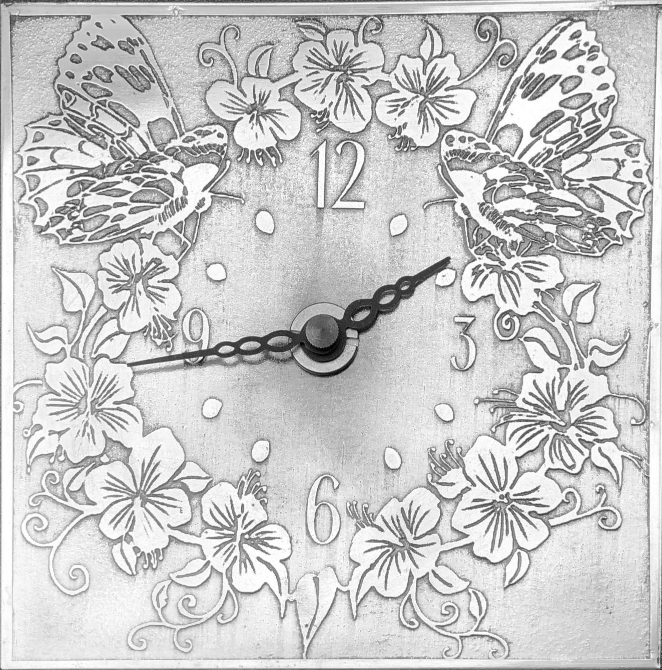 Small pewter clocks with the design etched onto pewter sheet. These cute little clocks measure only 11cm square and are best mounted on a small stand.