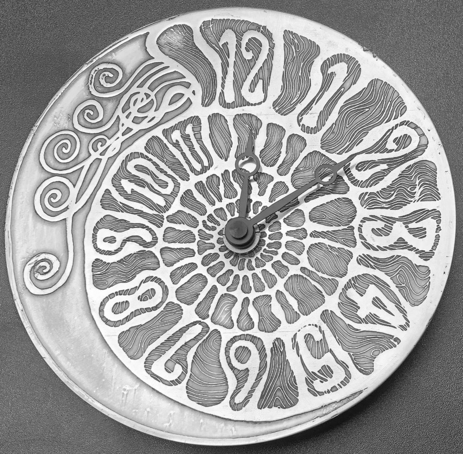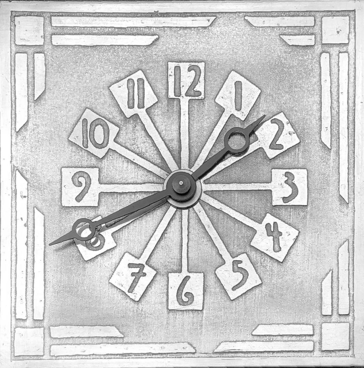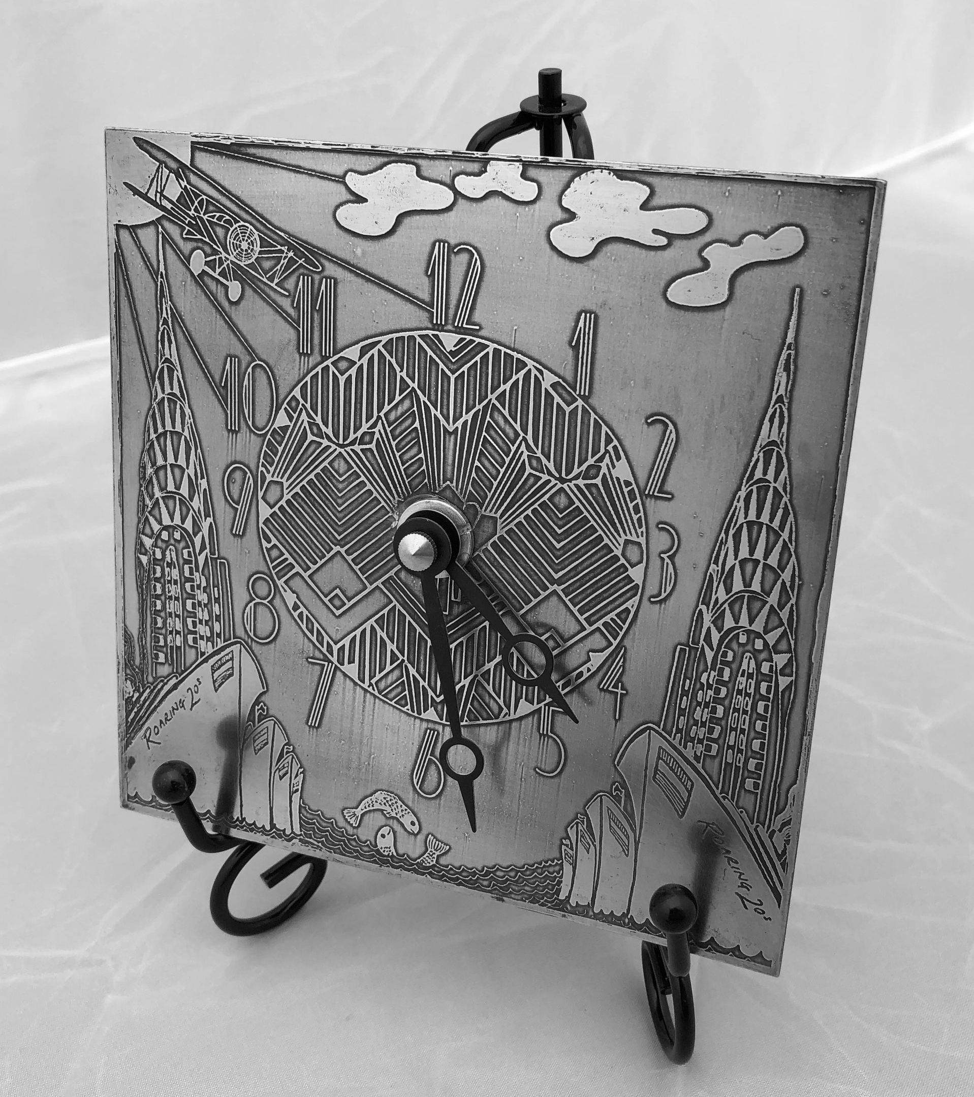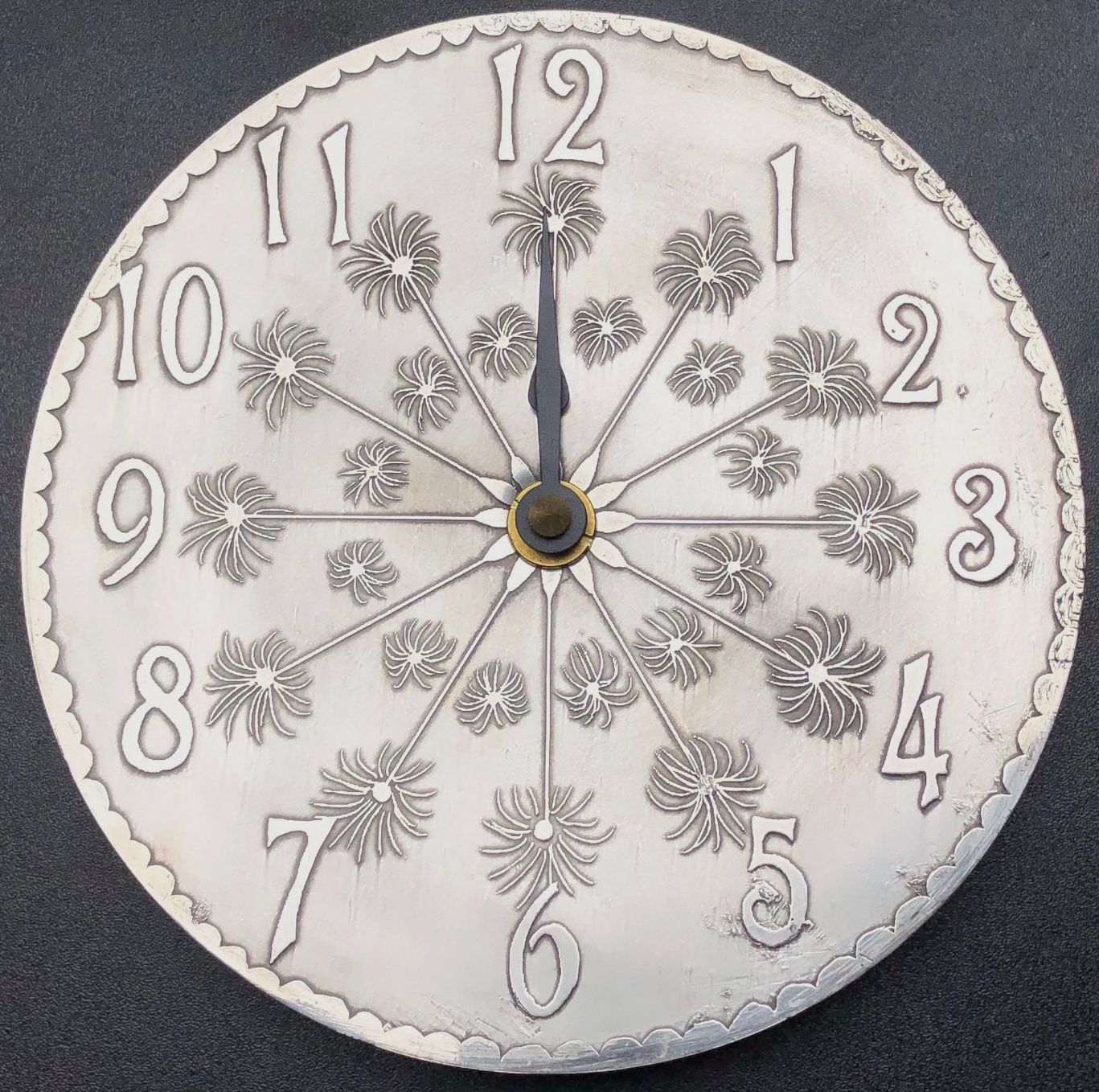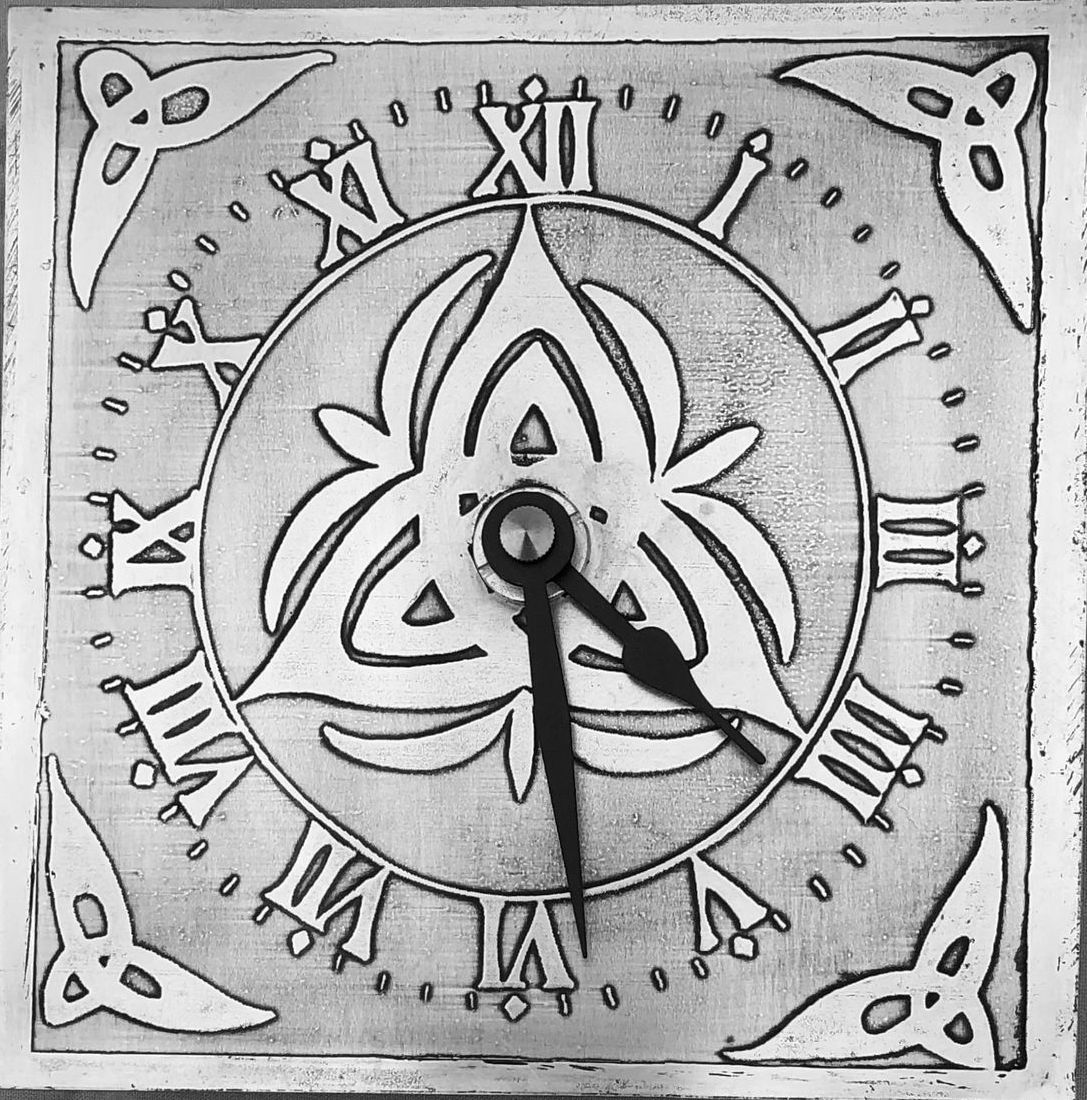 Small pewter clocks with the design etched onto pewter sheet. These cute little clocks measure only 11cm square and are best mounted on a small stand.